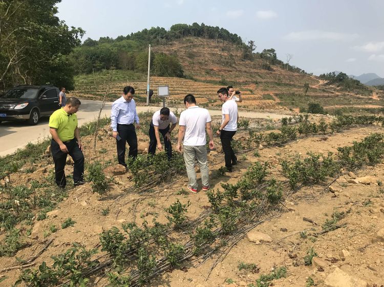 圖為:張士康(右二)主任,王盈峰工程師在總裁吳海江等陪同下,在瓊中物流園區(qū)海墾茶業(yè)生態(tài)科技園項(xiàng)目基地實(shí)地察看地形。