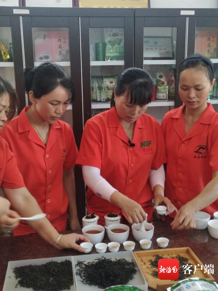 符小琴(中)與工友們品鑒研制茶葉。海墾茶業(yè)集團(tuán)供圖