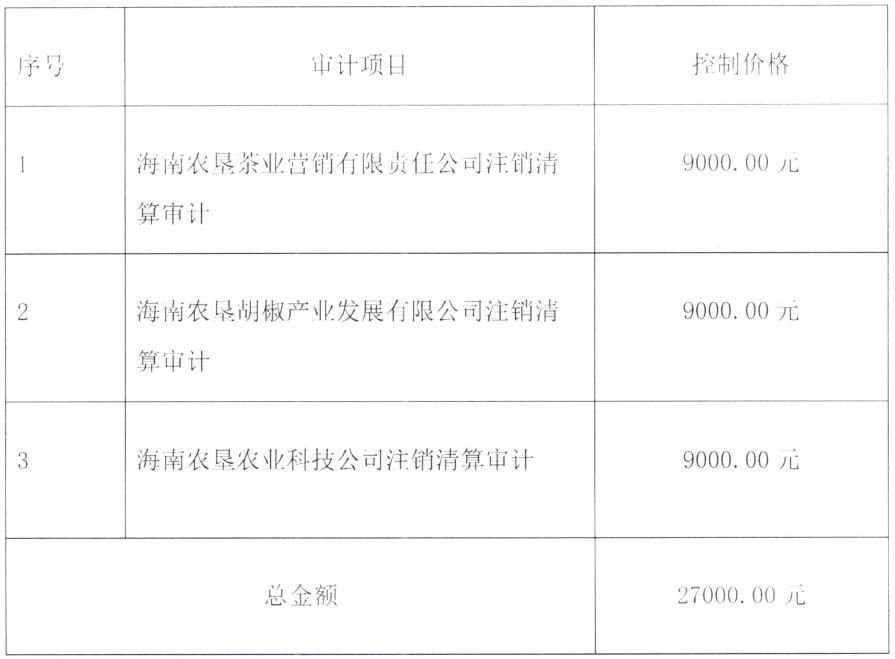 2023-08-31海南省農(nóng)墾五指山茶業(yè)集團股份有限公司旗下海南農(nóng)墾茶業(yè)營銷有限責(zé)任公司、海南農(nóng)墾胡椒產(chǎn)業(yè)發(fā)展有限公司、海南農(nóng)墾農(nóng)業(yè)科技公司共3家公司進行注銷,現(xiàn)擬選聘會計師事務(wù)所依法對上述3家公司開展清算審計,特邀請符合...